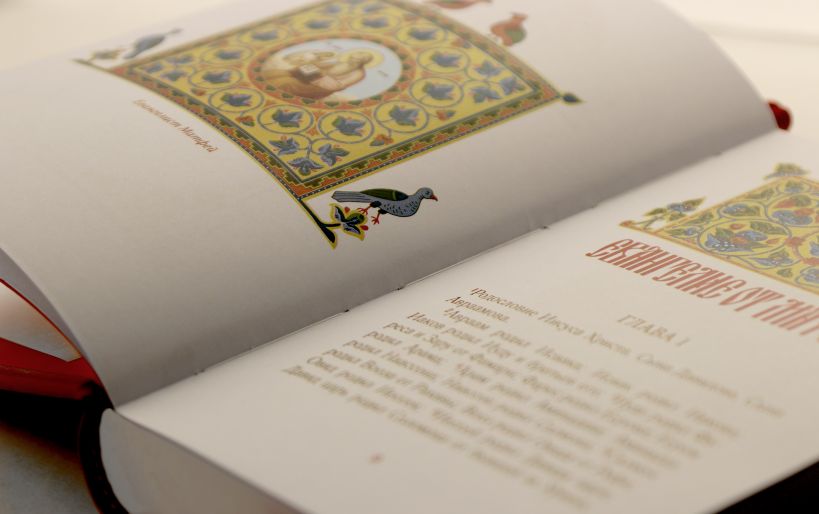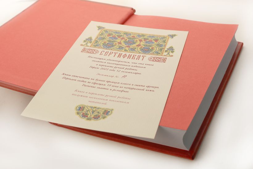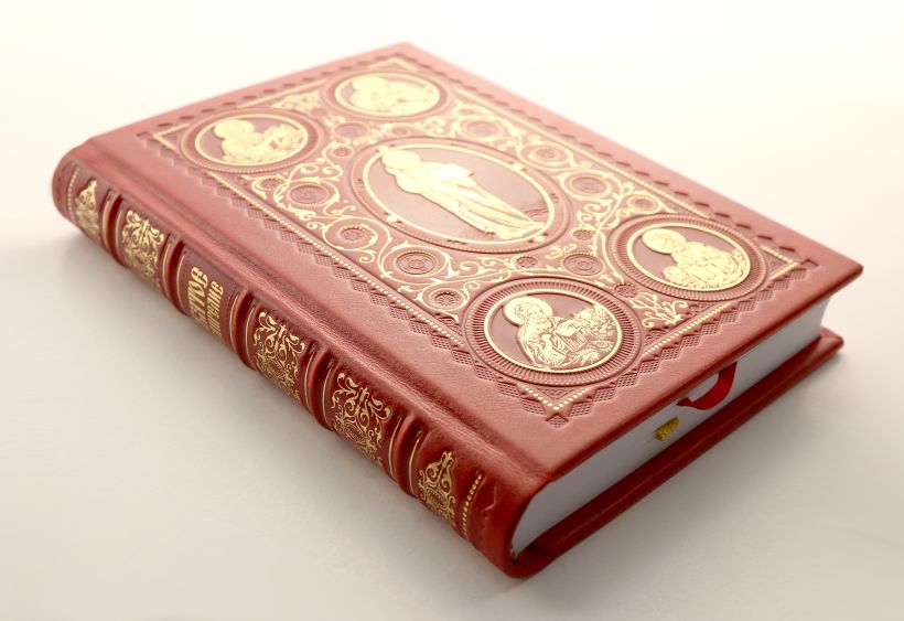 Коллекционное издание Святого Евангелия со множеством иллюстраций. Книга отпечатана на гладкой белой бумаге, сшита вручную, украшена византийскими орнаментами. Переплет из гладкой алой кожи изготовлен по традиционной технологии XIX века и украшен изящным тиснением. Форзацы из хлопковой бумаги, обрез обработан вручную, каптал и ляссе — шелковые. Сертификат, подтверждающий уникальность коллекционного переплета, вложен в каждый экземпляр и пронумерован вручную.