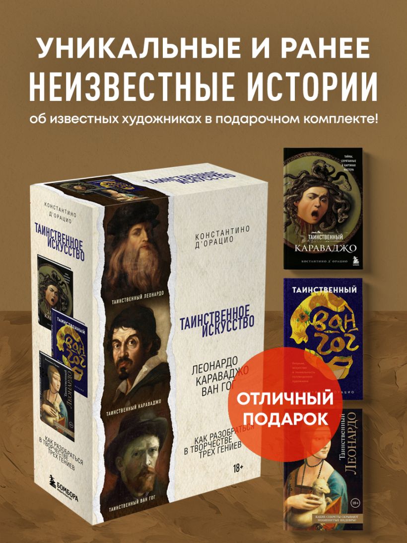 Подарочный комплект «Таинственное искусство» станет прекрасным путеводителем в те уголки искусства, которые все это время оставались тайными и неизведанными. Благодаря архивным документам и свидетельствам современников Леонардо да Винчи, Караваджо и Ван Гога вы узнаете о том, какие безумства творили эти художники, чтобы весь мир мог называть их гениями и сегодня.