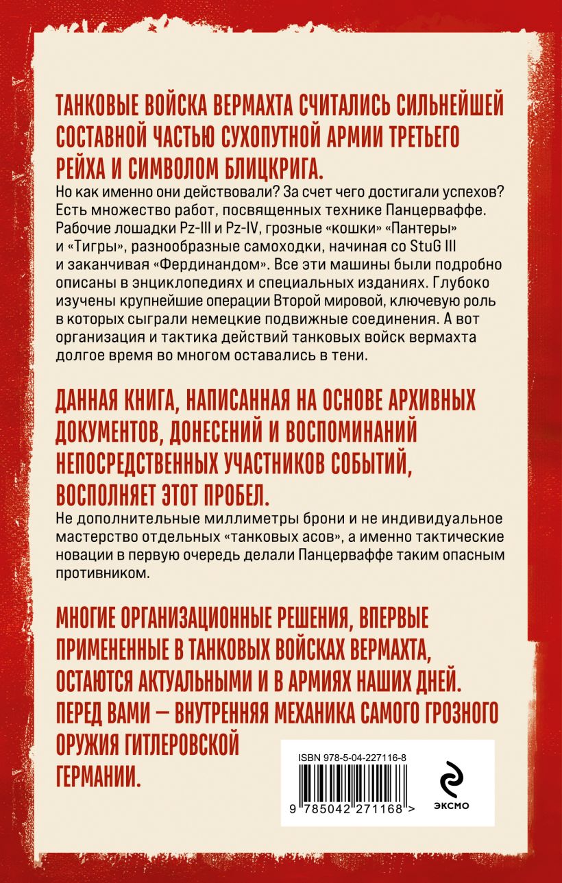 Есть множество работ, посвященных технике Панцерваффе. Рабочие лошадки Pz-III и Pz-IV, грозные "кошки" Пантеры и Тигры, разнообразные самоходки, начиная со StuG III и заканчивая "Фердинандом". Все эти машины были подробно описаны в энциклопедиях и специальных изданиях. Глубоко изучены крупнейшие операции Второй мировой, ключевую роль в которых сыграли немецкие подвижные соединения. А вот организация и тактика действий танковых войск вермахта долгое время во многом оставались в тени. Данная книга, написанная на основе архивных документов, донесений и воспоминаний непосредственных участников событий, восполняет этот пробел.