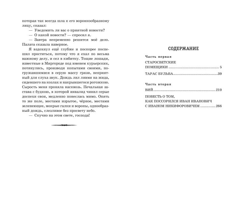 Книга содержит избранные повести Николая Гоголя из цикла «Миргород». Среди них такие, как «Старосветские помещики», «Тарас Бульба», «Вий», «Повесть о том, как поссорился Иван Иванович с Иваном Никифоровичем». Каждая история по-своему занимательна. Автор обращается к народным стереотипам и малороссийскому фольклору и увлекательно рассказывает как о быте, так и о мистике выбранного времени.