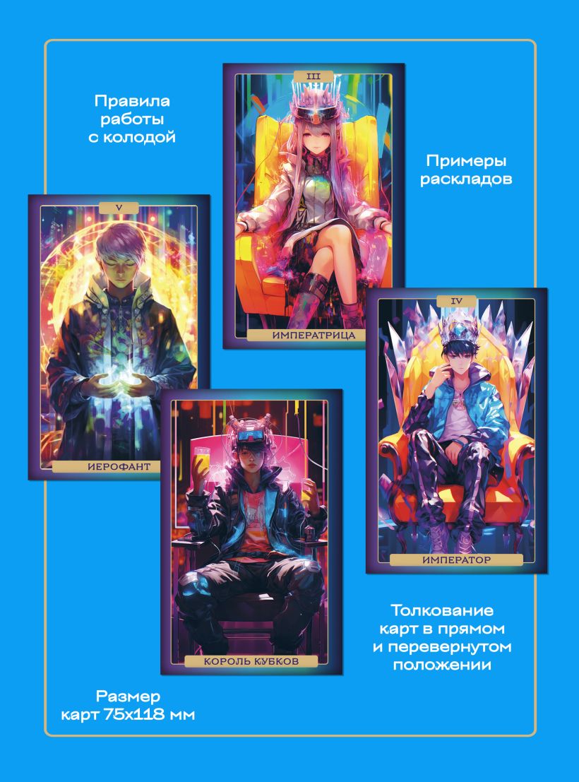 Эта колода таро создана для тех, кто любит аниме. Она нарисована художником при помощи нейросети, отвечает всем основным канонам гадательной системы таро и идеально подходит для первого знакомства с миром таро и гаданий. Герои аниме неонового города станут проводниками в волшебный мир таро и помогут т найти ответы на твои самые сокровенные вопросы. В брошюре даны все описания карт и их значения при раскладе в разных положениях.