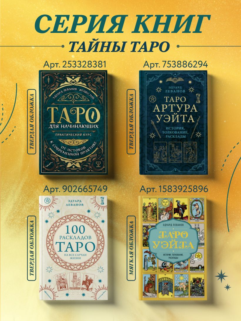 «Таро Уэйта» — изучаем подробно, системно и «с нуля». Эта книга для тех, кто хочет научиться читать легендарное Таро Уэйта и обращаться к картам за советом в своей повседневной жизни. Подробное системное руководство преподавателя и таролога Эдуарда Леванова поможет вам быстро запомнить толкования карт и изучить тайный язык Таро. • Базовое историческое толкование карт в прямом и перевернутом положении. • Современные значения карт для любовной, профессиональной и финансовой сфер. • Значения карт в качестве «карты дня» для быстрых предсказаний. • Рекомендации по работе с колодой и общие правила раскладов. • Более 20 тренировочных раскладов, которые помогут ответить на самые волнующие вопросы с примерами. Эдуард Леванов — таролог, преподаватель, коллекционер и исследователь Таро, автор полюбившейся читателям книги «Таро для начинающих», путеводителя по самой популярной колоде Таро — «Таро Артура Уэйта. История, толкование, расклады», также книги по раскладам «100 раскладов Таро на все случаи жизни». Его система чтения Таро основана на древних и традиционных значениях карт, адаптированных под современную реальность. В личной коллекции Эдуарда более 50 традиционных и старинных колод Таро, которые он использует в работе.