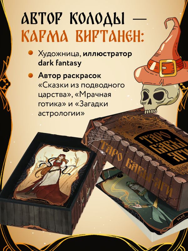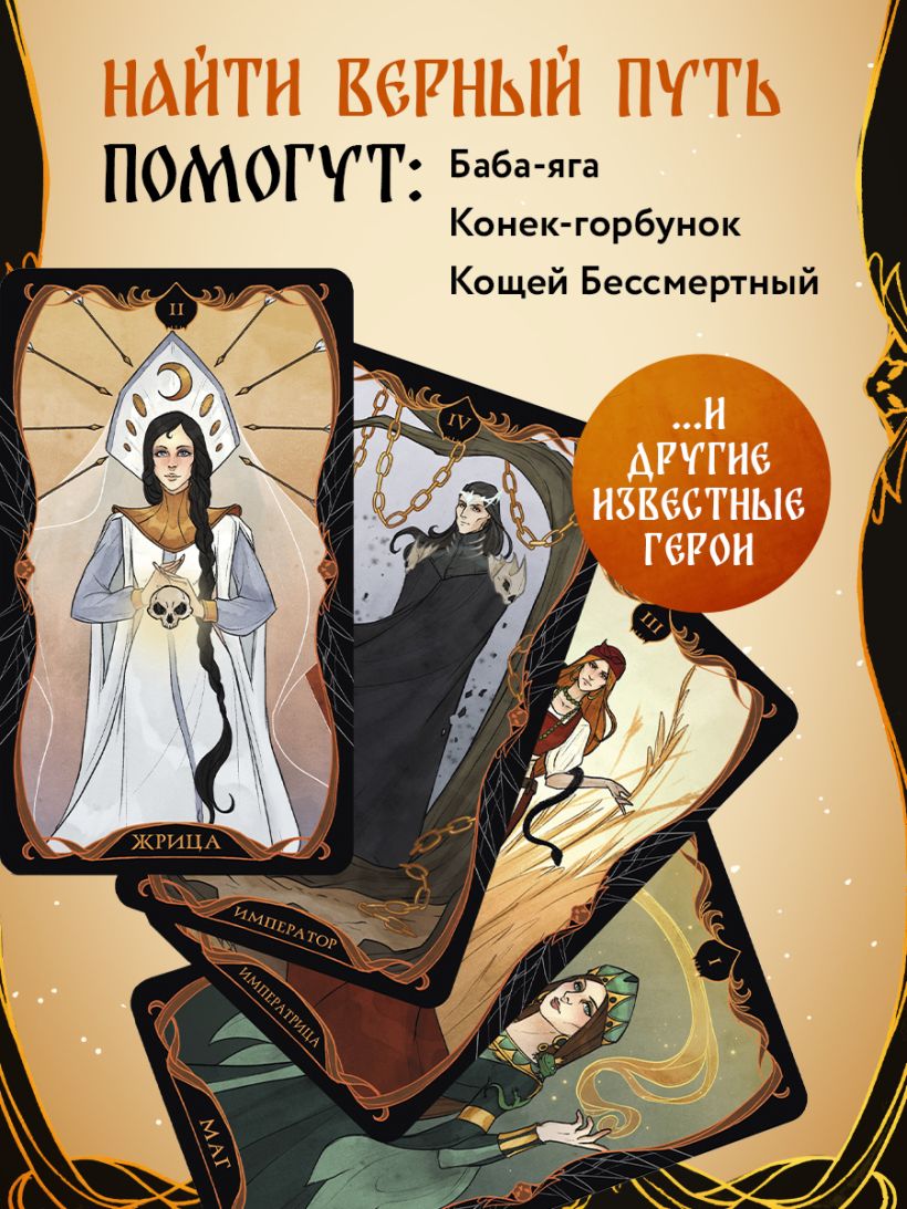 Баба Яга, проводница в таинственный мир волшебной русской сказки, собрала многовековые знания в руководстве, чтобы каждый мог заглянуть в будущее. Возможно, колода спасет вас от беды, поможет выбрать верный путь или же встретить свою судьбу. Не бойтесь заглянуть под полог тайны, раскинутый над грядущим. В конце концов, именно вы принимаете решение: осторожно повернуть назад или бесстрашно пойти направо, налево или прямо.