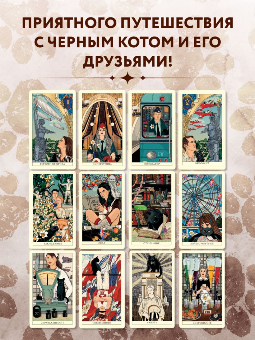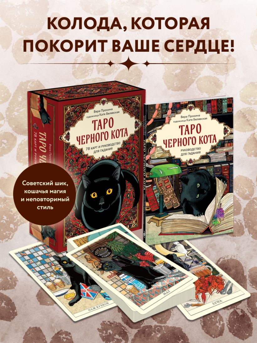 Абсолютное очарование для ценителей изящных коллекционных колод Таро. Очень стильная, яркая, ироничная колода, вдохновленная советским дизайном. В ней сочетается любовь к котикам, дизайну, истории и Таро. Художница Екатерина Белявская и дизайнер Вера Прокина создали неповторимую коллекционную колоду Таро для тонких ценителей дизайнерских вещей. Главный герой колоды — легендарный Черный кот, который тусит с пионерами, болтает с буфетчицами, ест черную икру и путешествует по московскому метро. Неповторимая атмосфера, ирония, великолепные иллюстрации в сочетании с символикой Таро Уэйта делает эту колоду уникальной. Колода «Таро Черного кота» — замечательный подарок: в комплект входит большая магнитная коробка, яркие плотные карты с фольгированным обрезом, цветная книга с руководством по гаданию.