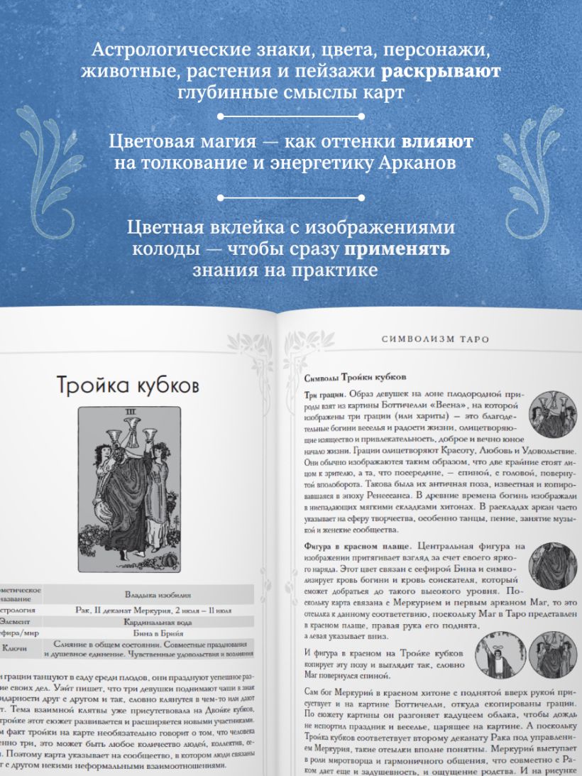 Цветная вклейка-приложение с изображениями колоды Таро Уэйта позволит подробно изучить цветовые решения и нюансы изображений, о которых рассказывается в книге.