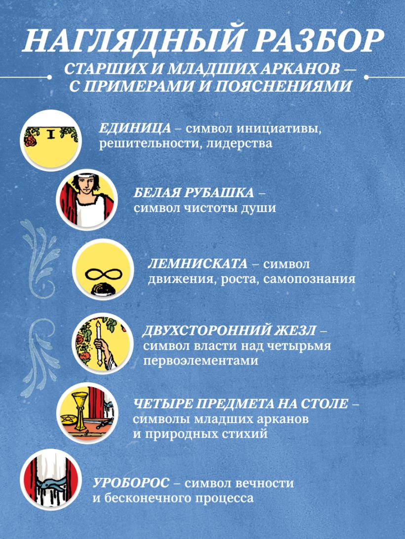 Разбор символизма Старших и Младших Арканов знаменитого Таро Уэйта — наглядно и подробно! — включает: