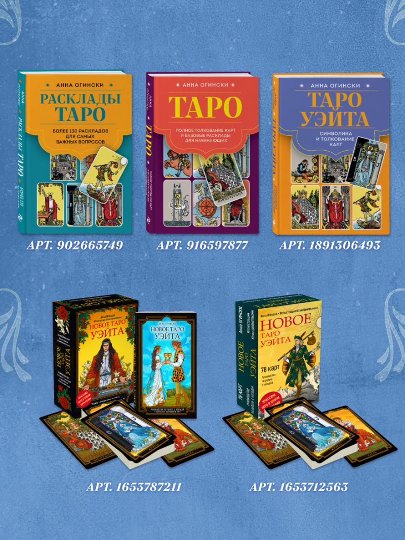 АННА ОГИНСКИ — руководитель учебного центра «Академия Ленорман», автор многочисленных книг, в числе которых «Таро. Полное толкование карт и базовые расклады для начинающих», «Расклады Таро. Более 130 раскладов для самых важных вопросов», «Оракул Ленорман. Самоучитель по гаданию и работе с картами», руководства к колоде «Новое Таро Уэйта» и к оракулу Ленорман «Тайный Сад», а также статей, курсов и материалов для самообучения по различным мантическим системам.