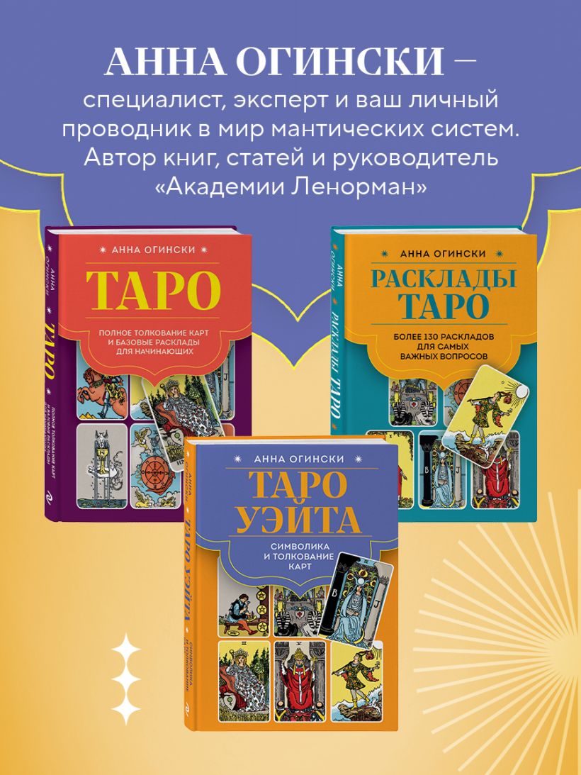 АННА ОГИНСКИ — руководитель учебного центра «Академия Ленорман», автор многочисленных книг, в числе которых «Таро. Полное толкование карт и базовые расклады для начинающих», «Расклады Таро. Более 130 раскладов для самых важных вопросов», «Оракул Ленорман. Самоучитель по гаданию и работе с картами», руководства к колоде «Новое Таро Уйэта» и к оракулу Ленорман «Тайный Сад», а также статей, курсов и материалов для самообучения по различным мантическим системам.
