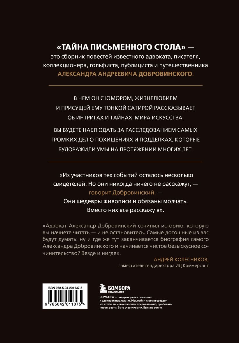 «Тайна письменного стола» — это сборник повестей известного адвоката, писателя, коллекционера, гольфиста, публициста и путешественника Александра Андреевича Добровинского.