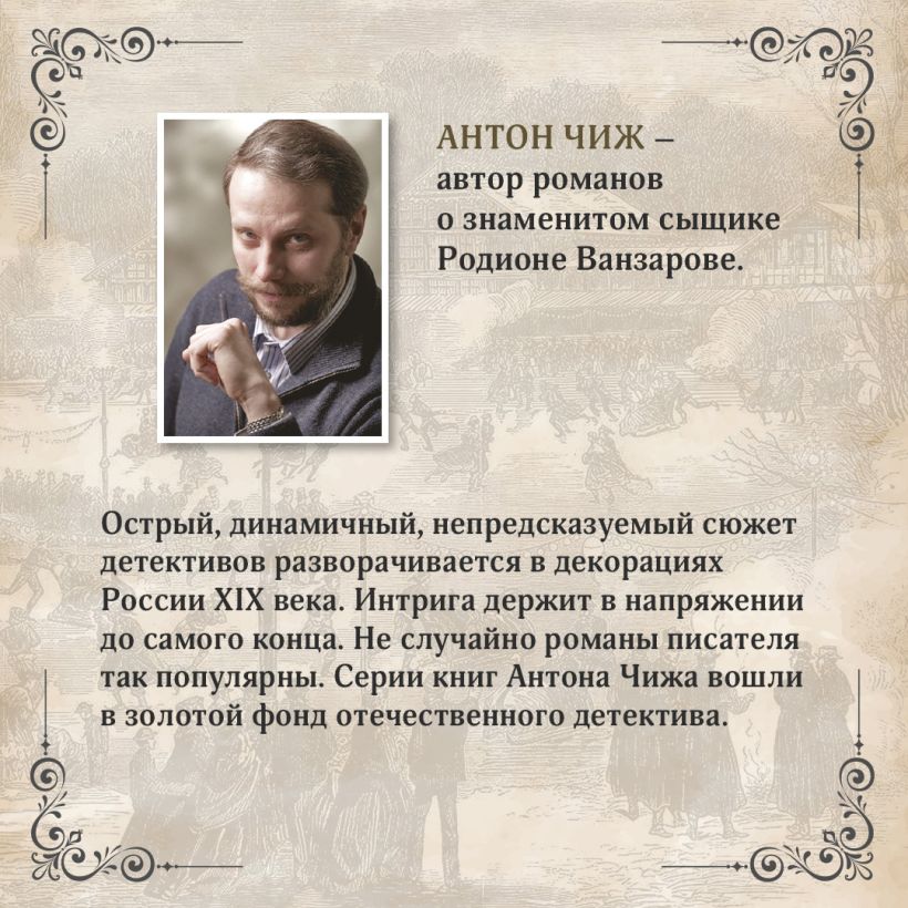 Антон Чиж — популярный российский писатель детективов. Его книги изданы общим тиражом более миллиона экземпляров. По остросюжетным романам Антона Чижа были сняты сериалы «Агата и сыск. Королева брильянтов» и «Агата и сыск. Рулетка Судьбы». Писатель в 20 романах создал, пожалуй, самых любимых читателями героев исторических детективов: Родиона Ванзарова и Аполлона Лебедева, Алексея Пушкина и Агату Керн. Острый, динамичный, непредсказуемый сюжет романов разворачивается в декорациях России XIX века. Интрига держит в напряжении до последней страницы. Кроме захватывающего развлечения, современный читатель находит в этих детективах ответы на вопросы, которые волнуют сегодня. Серии книг Антона Чижа вошли в «золотой фонд» отечественного исторического детектива.