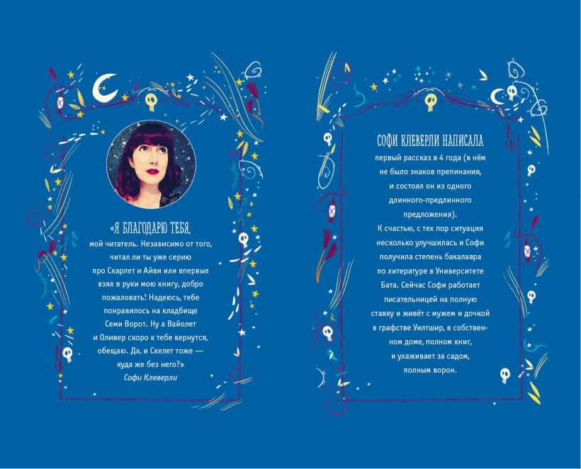 «Я благодарю тебя, мой читатель. Независимо от того, читал ли ты серию про Скарлет и Айви или впервые взял в руки мою книгу — добро пожаловать! Надеюсь, тебе понравится на кладбище Семи Ворот». — Софи Клеверли