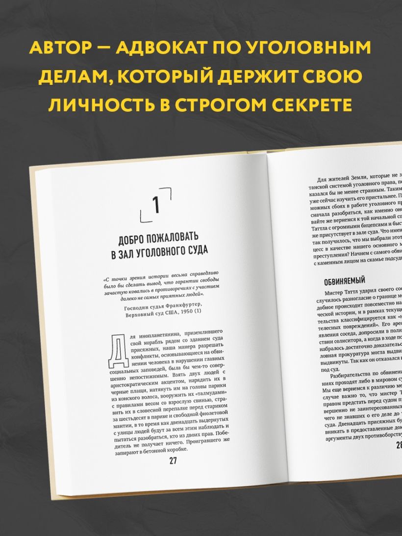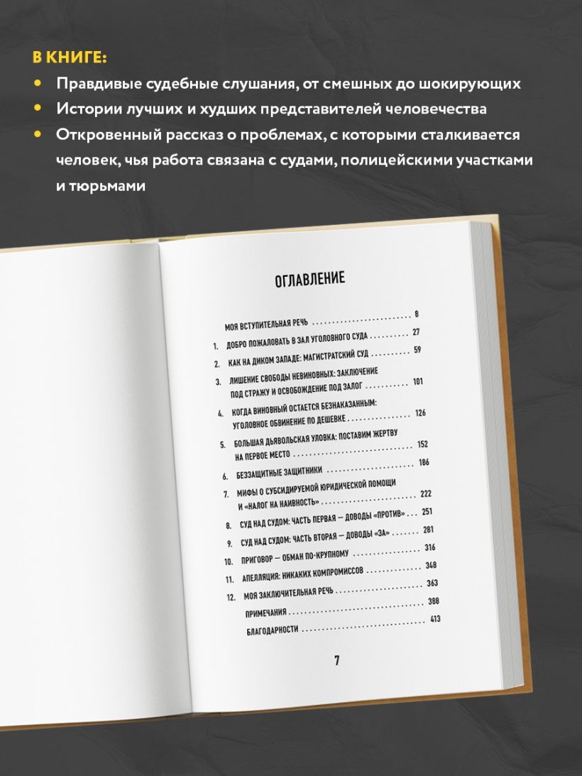 Здесь приведены правдивые истории из зала суда. Иногда они смешные, часто захватывающие, порой шокирующие. От преступников до адвокатов, а также жертв, свидетелей и стражей правопорядка — здесь вы встретите лучших и худших представителей человечества.