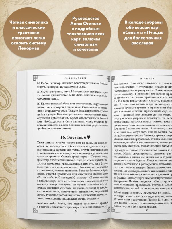 • Руководство от Анны Огински с подробным толкованием всех карт, включая символизм, тематические значения и сочетания карт.