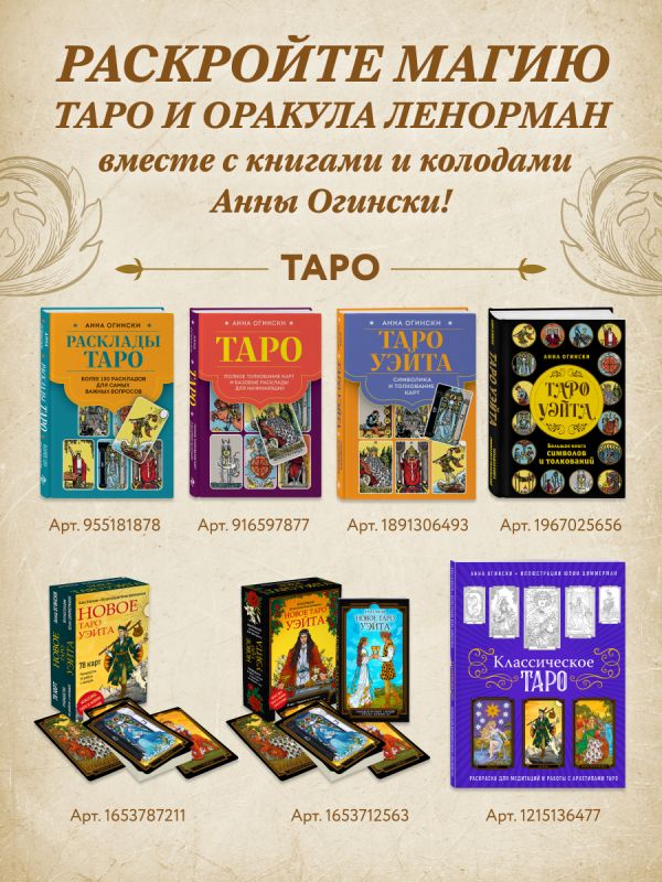 Простое и понятное руководство по символизму знаменитого Таро Уэйта от Анны Огински, руководителя учебного центра «Академия Ленорман» и автора популярных книг-самоучителей по Таро и оракулу Ленорман, поможет вам научиться понимать и читать тайные смыслы карт. В этой книге вы найдете все, что нужно, чтобы расшифровать послания самой популярной колоды Таро в мире! Вас ждет: • Краткая информация о структуре колоды Таро. • Понятное описание каждой карты Таро Уэйта. • Расшифровка главных символических деталей Таро Уэйта — карта за картой. • Значения Старших и Младших Арканов в прямом и перевернутом положении. • Слова-ключи, помогающие запомнить толкование карты. АННА ОГИНСКИ — руководитель учебного центра «Академия Ленорман», автор многочисленных книг, в числе которых «Таро. Полное толкование карт и базовые расклады для начинающих», «Расклады Таро. Более 130 раскладов для самых важных вопросов», «Оракул Ленорман. Самоучитель по гаданию и работе с картами», руководства к колоде «Новое Таро Уйэта» и к оракулу Ленорман «Тайный Сад», а также статей, курсов и материалов для самообучения по различным мантическим системам.