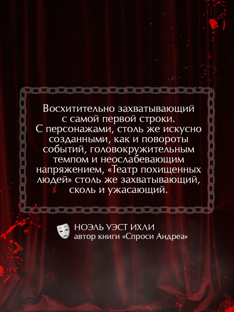 «Восхитительно захватывающий с самой первой строки. С персонажами, столь же искусно созданными, как и повороты событий, головокружительным темпом и неослабевающим напряжением, "Театр похищенных людей" столь же захватывающий, сколь и ужасающий». — Ноэль Уэст Ихли, автор книги «Спроси Андреа»