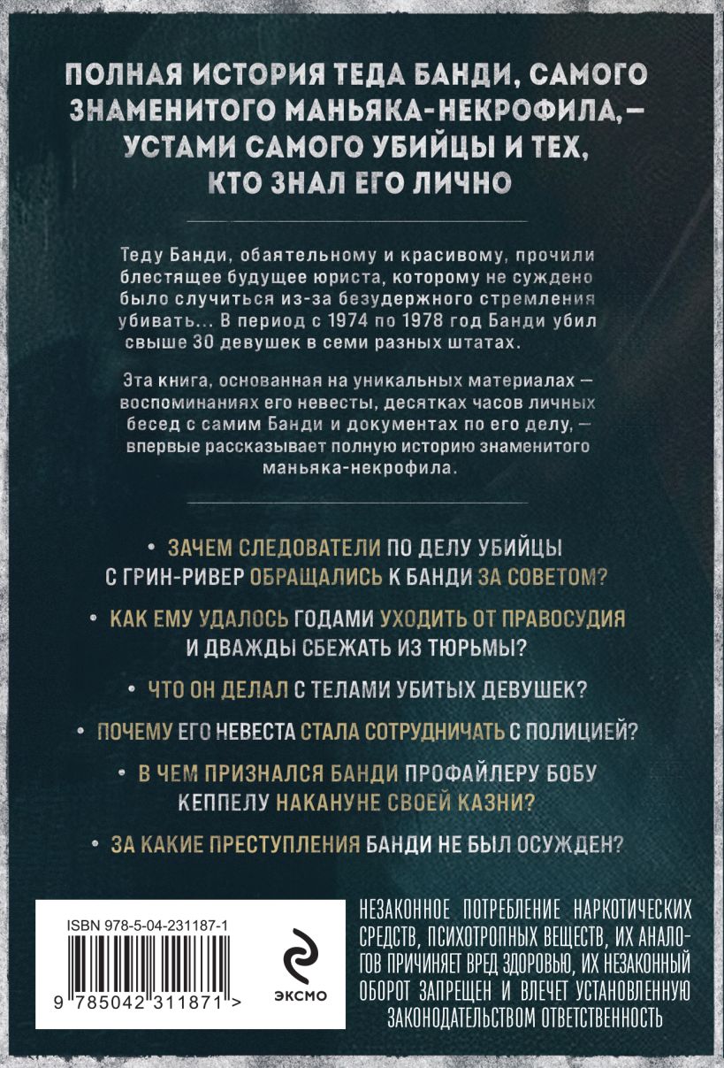 Эта книга, основанная на уникальных материалах — воспоминаниях его невесты, десятках личных часов бесед с самим Банди, и документах по его делу, — раскрывает подробности, неизвестные прежде. Почему следователи по делу Убийцы с Грин-Ривер обращались к Банди за консультацией и чем он им помог? Как ему удавалось годами уходить от правосудия и дважды сбежать из тюрьмы? Что он делал с телами убитых девушек? Сотрудничала ли его невеста с полицией? Увлекательная и шокирующая, эта книга впервые рассказывает полную историю маньяка-некрофила, ставшего синонимом серийного убийства.