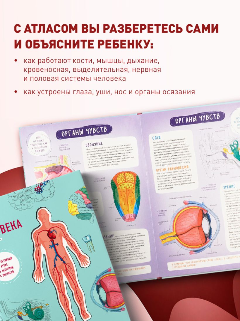 Первый детский интерактивный атлас с вырубкой «6 систем человеческого организма» отпечатан на тончайшей пленке ПВХ. Переворачивая страницы, вы наглядно можете познакомиться с костной, мышечной, кровеносной, дыхательной, мочевыделительной, нервной и половой системами, органами зрения, обоняния, слуха и осязания.