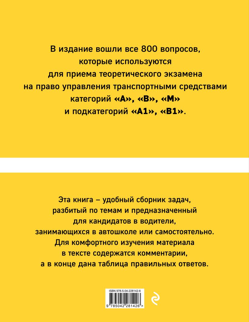 В издание вошли все 800 вопросов, которые используются для приема теоретического экзамена на право управления транспортными средствами категории «А», «В», «М» и подкатегорий «А1», «В1».