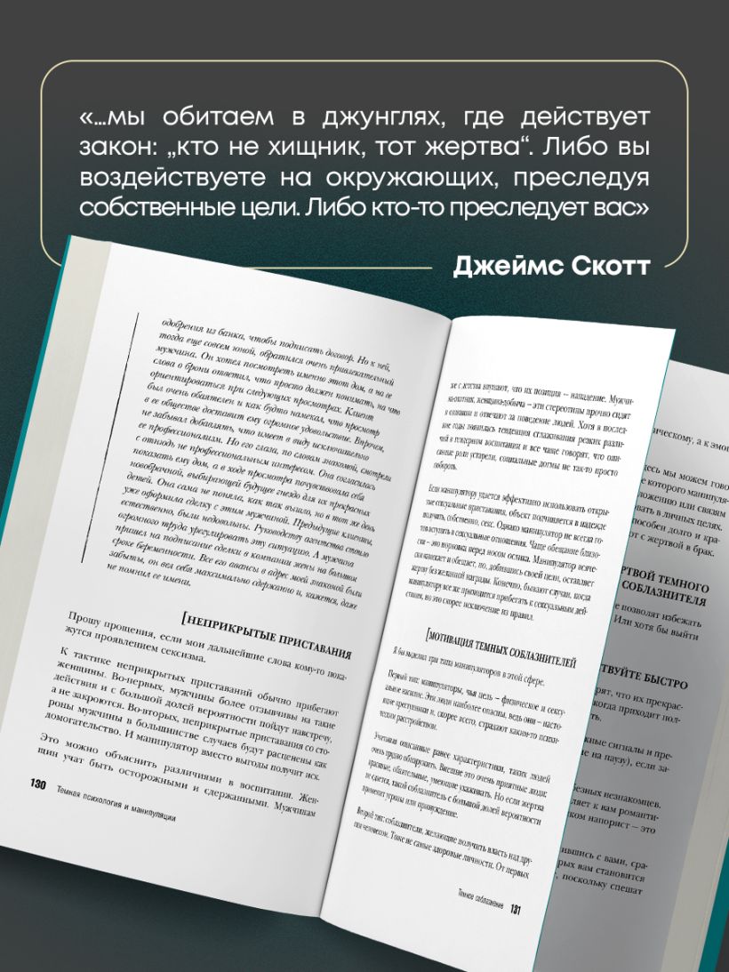 Джеймс Скотт, профессор Чикагского университета, собрал воедино все разрушительные способы воздействия — от обмана до газлайтинга и макиавеллизма. Автор приводит множество реальных примеров и научных исследований, а еще демонстрирует, как темная психология применяется в различных контекстах — личных отношениях, корпоративных интригах и политической борьбе. Особое внимание он уделяет тому, как противостоять манипуляциям, защищать себя от агрессивного воздействия и сохранять психологическую устойчивость.