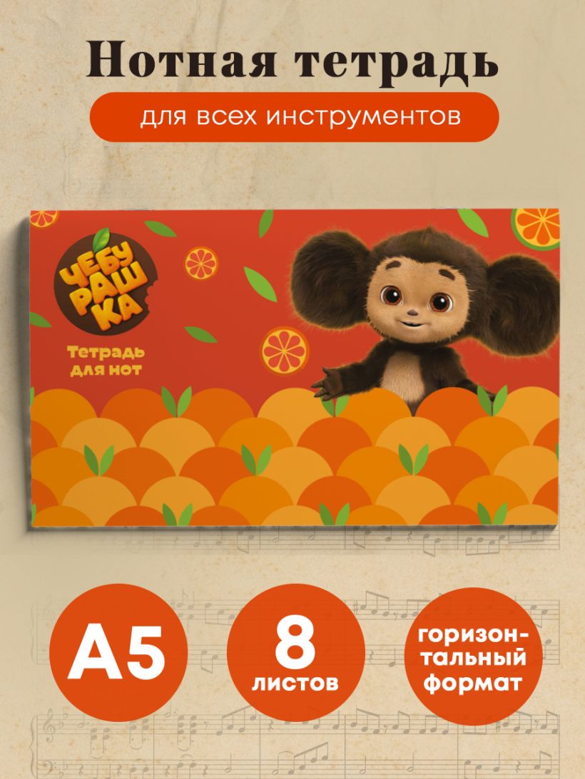 Тетрадь для нот. Чебурашка с мандаринами (8 л., А5, горизонтальная, скрепка)