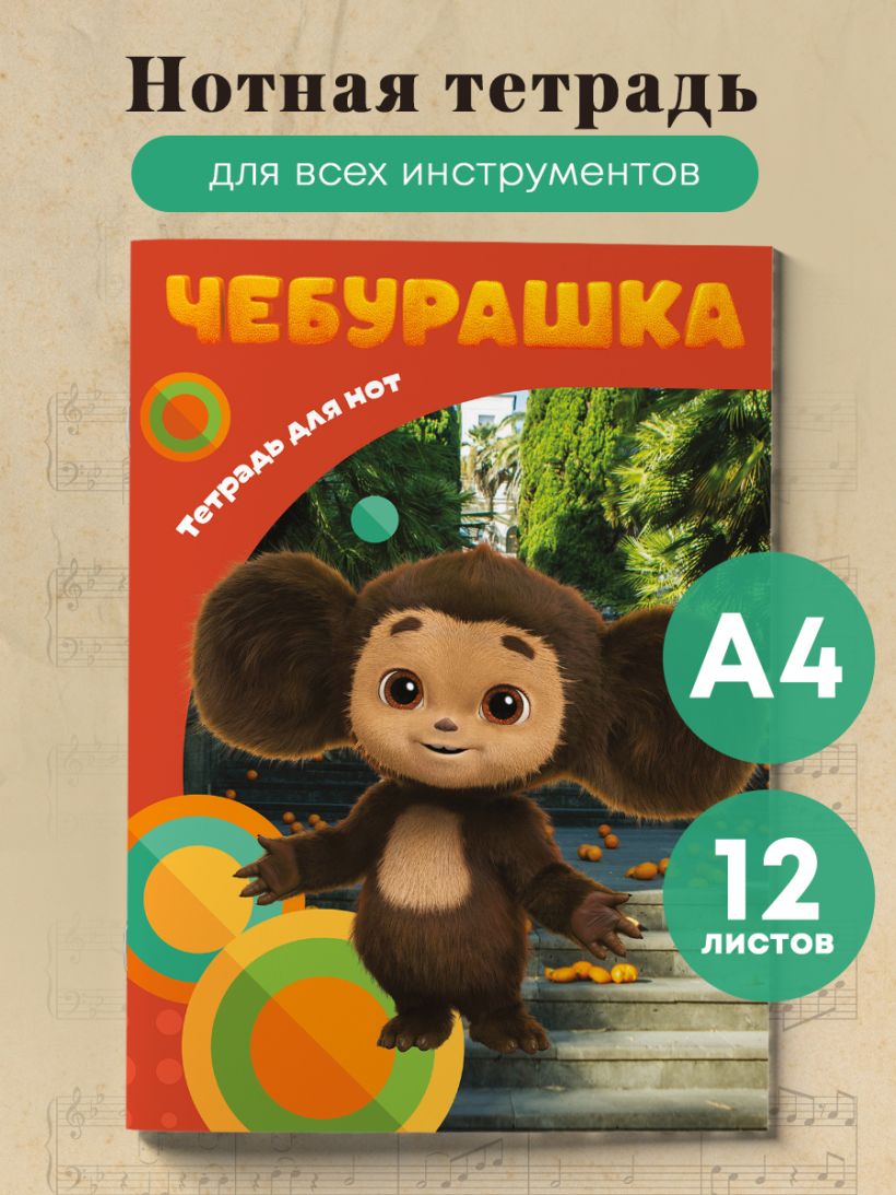 Тетрадь для нот. Милый Чебурашка (12 л., А4, вертикальная, скрепка)