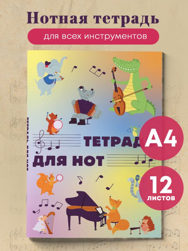 Тетрадь для нот. Животные-музыканты (12 л., А4, вертикальная, скрепка)