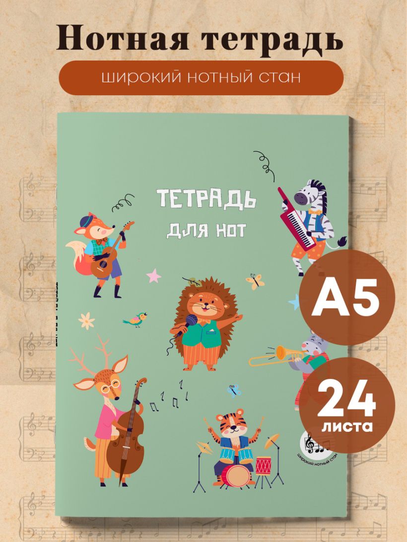 Тетрадь для нот с расширенным станом. Лесной оркестр (24 л., А5, вертикальная, скрепка)