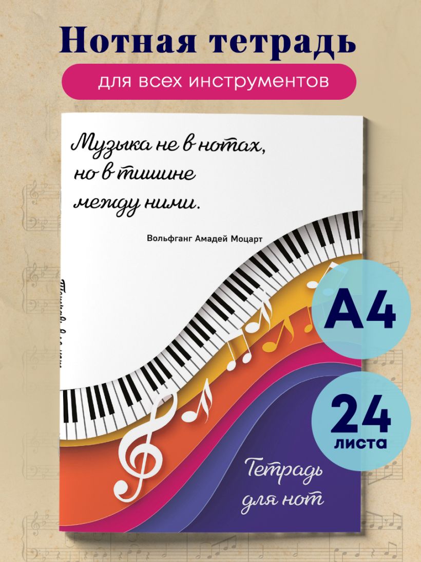 Музыка начинается с первой ноты — выберите тетрадь, которая вдохновляет! Помогите юному музыканту быстро и с интересом освоить нотную грамоту! Эта тетрадь создана специально для детей, которые начинают свое знакомство с музыкой: она помогает развивать слух, память и творческое мышление, превращая обучение в вдохновляющий процесс. Почему родители выбирают именно эту тетрадь: - Расширенный нотный стан — удобен для первых шагов и более сложных произведений. - Компактный формат А5 — идеально подходит для занятий дома, на уроках и в дороге. - Плотная белая офсетная бумага — не просвечивает, выдерживает многократное стирание карандашом. - 48 страниц — оптимально для учебного курса и регулярных занятий. Тетрадь станет надежным спутником в музыкальном обучении — здесь удобно писать, делать заметки и фиксировать первые мелодии. Подарите ребенку возможность развивать талант и почувствовать себя настоящим композитором.