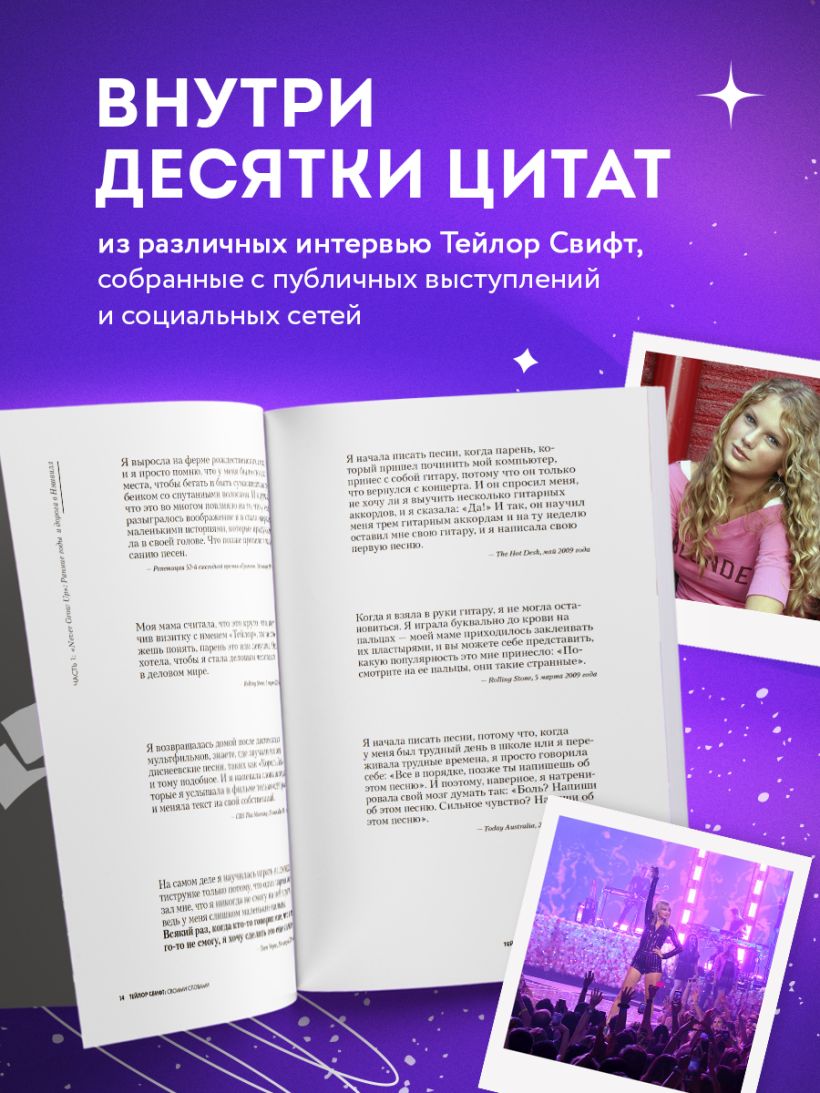Ответ на этот вопрос дает книга из цикла «Своими словами». Внутри собрана жизнь певицы, ее карьерные достижения, взросление, отношения с людьми и многое другое через призму ее же восприятия. Отрывки из интервью и публикаций в социальных сетях дают максимально полное представление о жизни Тейлор.