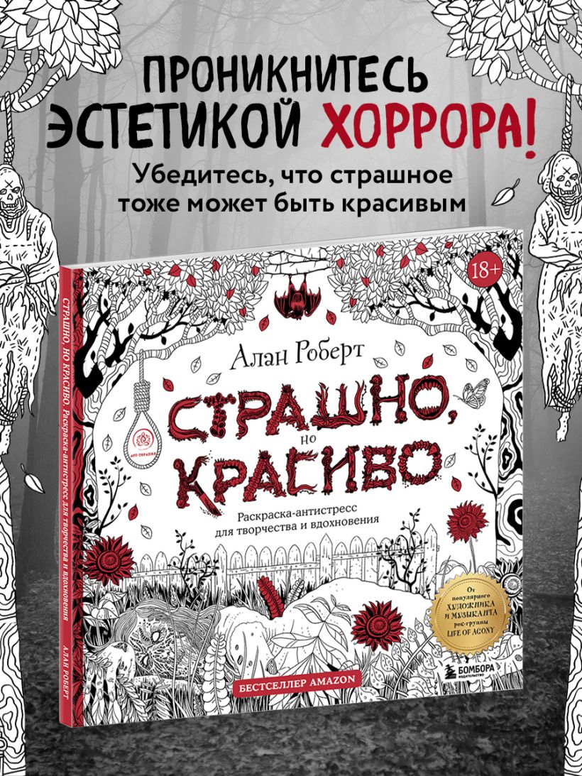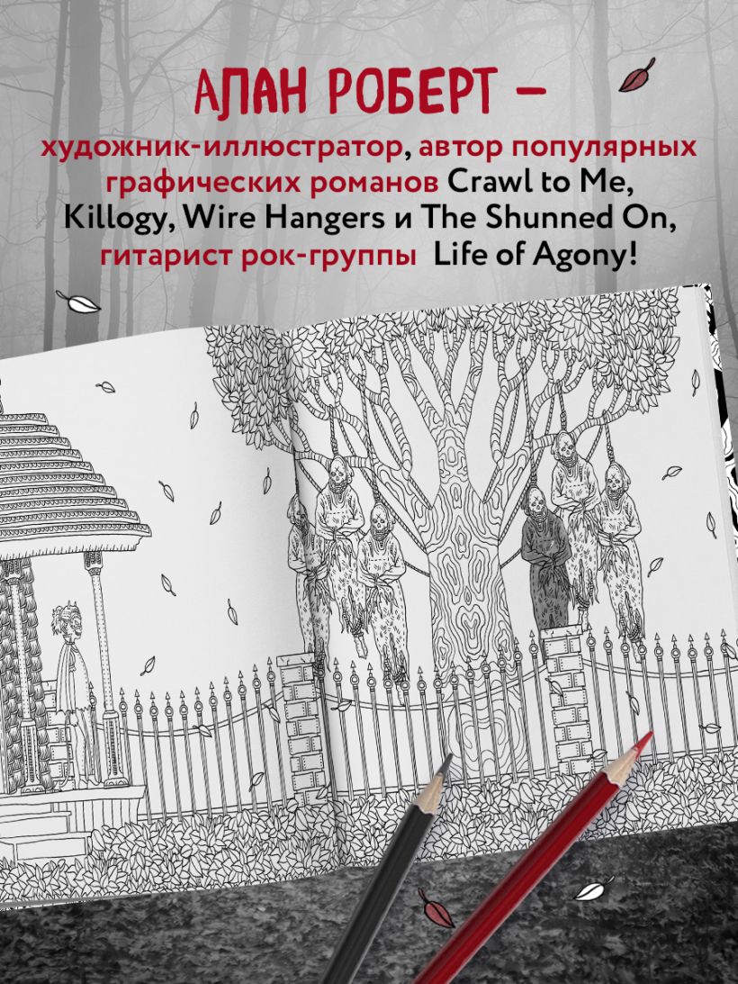 Создатель «Страшно, но красиво» — Алан Роберт — известный художник-иллюстратор и бас-гитарист американской рок-группы Life of Agony, автор графических романов Crawl to Me, Killogy, Wire Hangers и The Shunned One. Его серия раскрасок The Beauty of Horror, первая часть которой перед вами, стала бестселлером Amazon и завоевала весь мир! Она получила признание публики благодаря неповторимому и особенному стилю художника, его рисунки одновременно ужасны и прекрасны.
