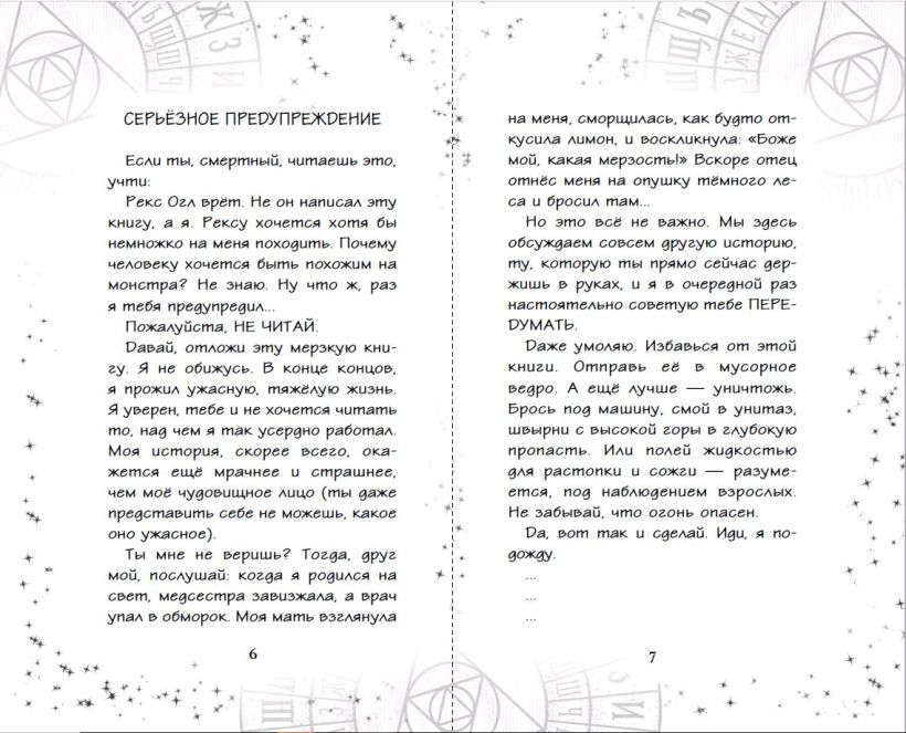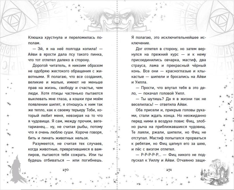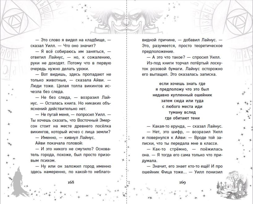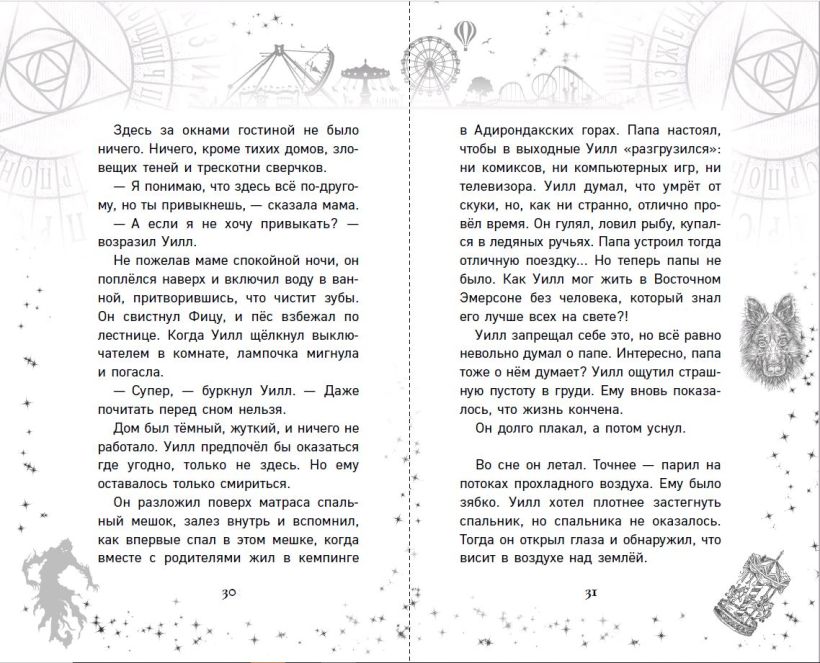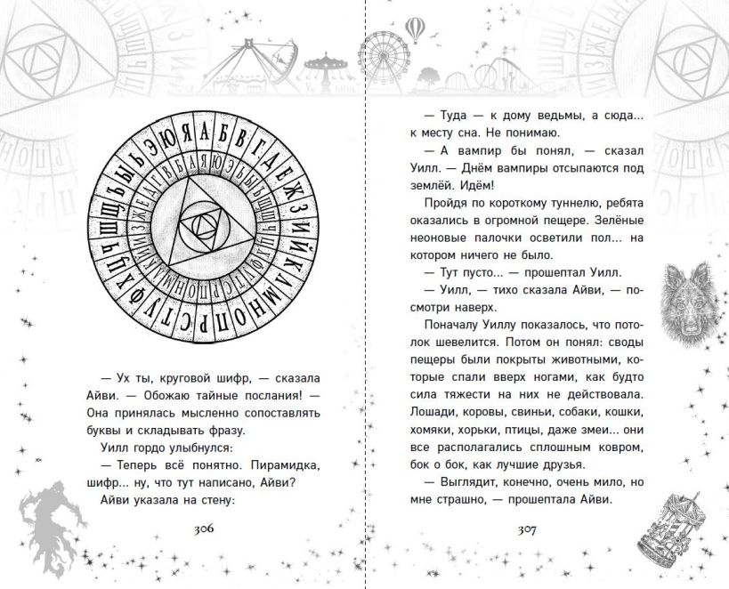 Броское оформление обложки + чёрно-белые виньетки внутри. Пугающая атмосфера гарантирована! Внутри — описания заброшенного парка аттракционов, страшные пророчества и разгадки сложных шифров.