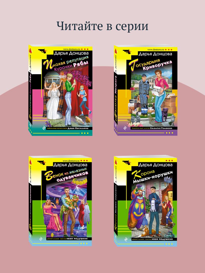 «Кладбище чужих секретов» Краткое определение интеллигентного человека таково: он очень хочет дать кому-то в глаз, но сдерживается и радостно улыбается всему миру. Вот и Иван Подушкин всегда радуется клиентам, даже если они приходят без предупреждения. Повод для визита к детективу у врача Деревянкина Рудольфа оказался просто ужасным. Его мать, эксцентричная Элли, умерла при весьма странных обстоятельствах. Вскрытие обнаружило отравление адским коктейлем из разных препаратов. Рудольф просит Ивана найти убийцу. В поисках правды сыщик сталкивается с загадочным «Великим Жрецом». Его ритуалы в заброшенном селе Бакино связывают жизни матери Рудольфа, ее подруги Николетты и других влиятельных персон. Мистические собрания, кладбище секретов и вода из проклятого болота — ключи к разгадке смерти Элли... Дарья Донцова — самый популярный и востребованный автор в нашей стране, любимица миллионов читателей. В России продано более 200 миллионов экземпляров ее книг. Ее творчество наполняет сердца и души светом, оптимизмом, радостью, уверенностью в завтрашнем дне! «Донцова невероятная работяга! Я не знаю ни одного другого писателя, который столько работал бы. Я отношусь к ней с уважением, как к образцу писательского трудолюбия. Женщины нуждаются в психологической поддержке и получают ее от Донцовой. Я и сама в свое время прочла несколько романов Донцовой. Ее читают очень разные люди. И очень занятые бизнес-леди, чтобы на время выключить голову, и домохозяйки, у которых есть перерыв 15—20 минут между отвести-забрать детей». — Галина Юзефович, литературный критик «Амур с гранатой» Почему мы доверяем людям? Одним — потому что хорошо с ними знакомы. Другим — потому что совсем с ними не знакомы. Вера Холодова бесконечно доверяла своему сожителю Сергею Кузнецову! И чем же он ей отплатил? Пара жила душа в душу. Сергей дарил подарки, купил щенка и котенка, обещал Вере настоящую свадьбу. И вот недавно, приехав с работы, Вера обнаруживает у дома чемоданы со своими вещами. Рядом котенка со щенком, привязанных к лавочке, и записку со словами: «Я вернусь! Зуб даю! А пока уезжай к себе…» Холодова обращается в офис особых бригад с просьбой разыскать возлюбленного. Татьяна Сергеева и Димон Коробков начинают расследование. Сыщики узнают, что мужчина часто менял номера телефонов и не всегда был честен с Верой. Вероятно, он вообще был не тем, за кого себя выдавал. Но в ходе расследования выясняется, что Сергей вовсе не первый «пропавший» мужчина в жизни Холодовой, и дело может быть гораздо серьезнее, чем кажется на первый взгляд. Дарья Донцова — самый популярный и востребованный автор в нашей стране, любимица миллионов читателей. В России продано более 200 миллионов экземпляров ее книг. Ее творчество наполняет сердца и души светом, оптимизмом, радостью, уверенностью в завтрашнем дне! «Донцова невероятная работяга! Я не знаю ни одного другого писателя, который столько работал бы. Я отношусь к ней с уважением, как к образцу писательского трудолюбия. Женщины нуждаются в психологической поддержке и получают ее от Донцовой. Я и сама в свое время прочла несколько романов Донцовой. Ее читают очень разные люди. И очень занятые бизнес-леди, чтобы на время выключить голову, и домохозяйки, у которых есть перерыв 15—20 минут между отвести-забрать детей». — Галина Юзефович, лите