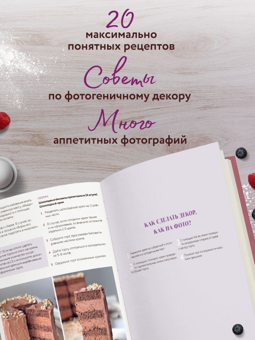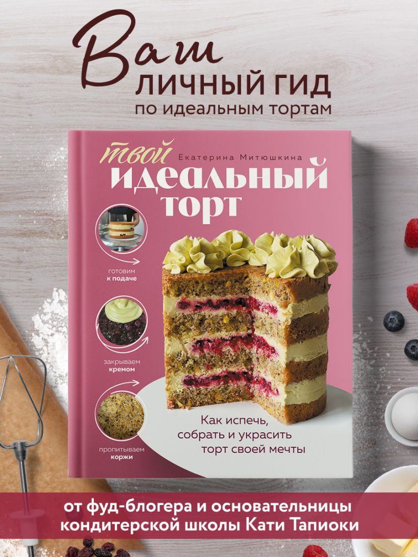 В своей новой книге Екатерина Митюшкина по полочкам разложит, как испечь и собрать 20 идеальных тортов. С помощью пошаговых рецептур вы легко освоите азы кондитерского искусства, а подробная фотоинструкция по сборке не оставит ни шанса на ошибку.