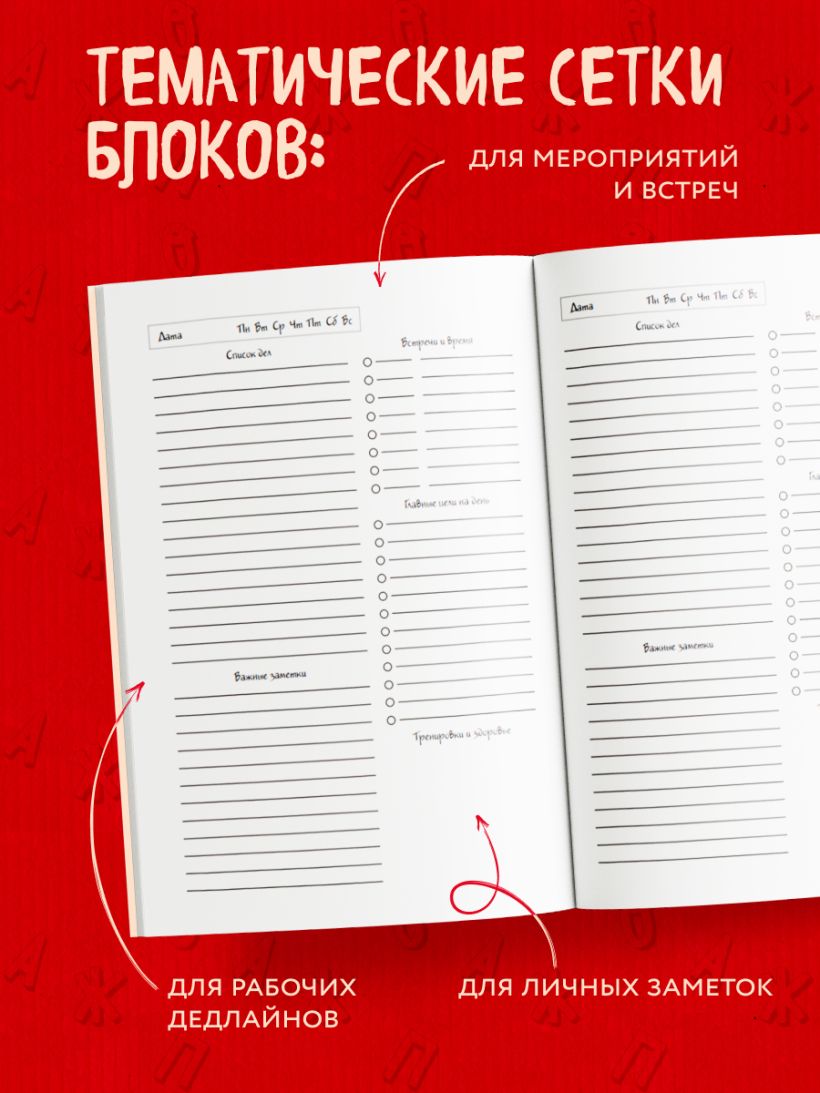 - Сетка блока создана с учетом современных тенденций европейского дизайна: часть распределена по времени — для рабочих дедлайнов, часть — линейки, которые можно использовать как для личных заметок, так и для планирования рабочих задач.