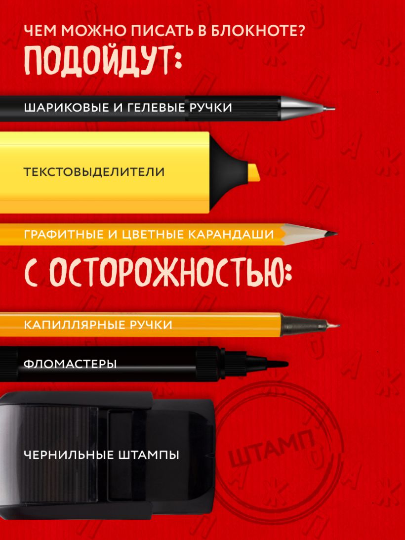 - Белая плотная бумага внутри — не бликует, не просвечивает, выдерживает даже маркерные хайлайтеры.