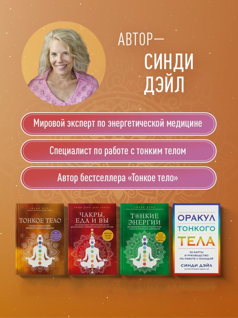 Синди Дэйл — автор более 30 всемирно известных книг об энергетической медицине и интуиции, в том числе бестселлера «Тонкое тело. Полная энциклопедия биоэнергетической медицины». Ее книги переведены более чем на 20 языков. Клиентами и учениками Дейл стали свыше 80 000 людей. Она путешествует по всему миру, стремясь научиться и научить целительству. Также у нее есть два сына, внучка и очень много домашних животных.