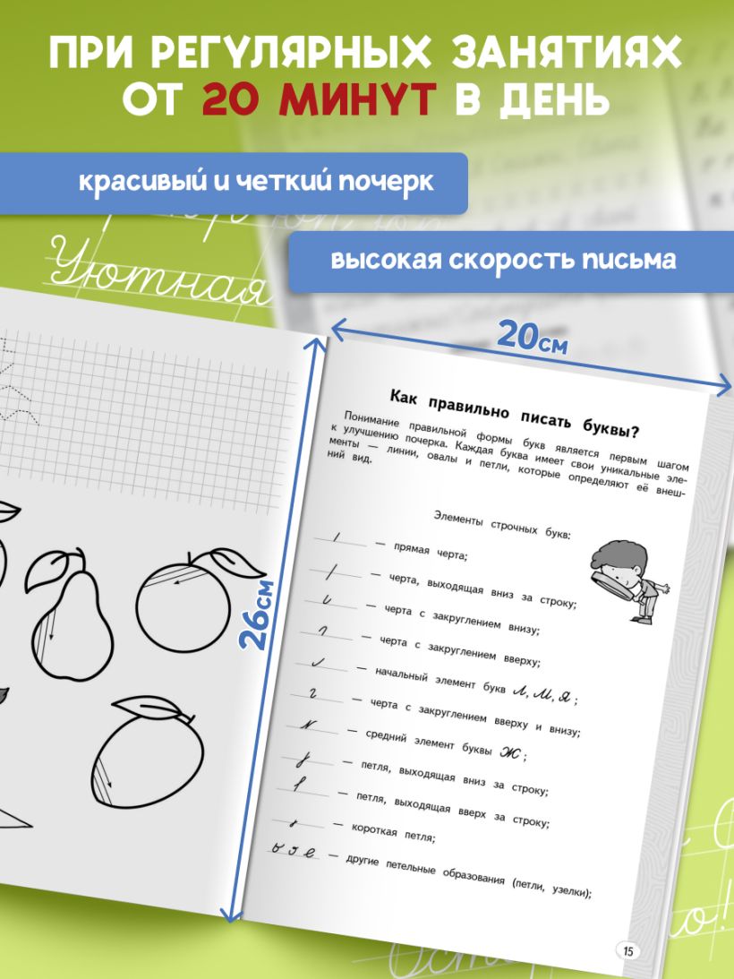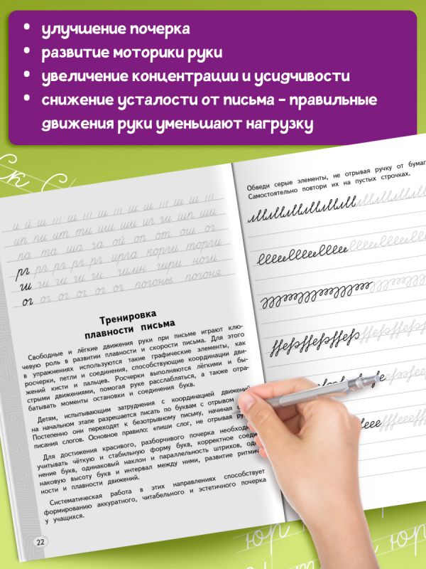 Чистописание способствует развитию устной речи, памяти и интеллекта, потому что при письме активизируются соответствующие области мозга. Помимо этого, красивый и чёткий почерк улучшает мелкую моторику, координацию движений и глазомер. Неверное написание букв и неправильное их соединение может привести к проблемам не только с правописанием, но и с изложением своих мыслей на письме. Уникальные задания по каллиграфии позволят ученикам начальной школы не только значительно улучшить почерк, но и повысить скорость письма.