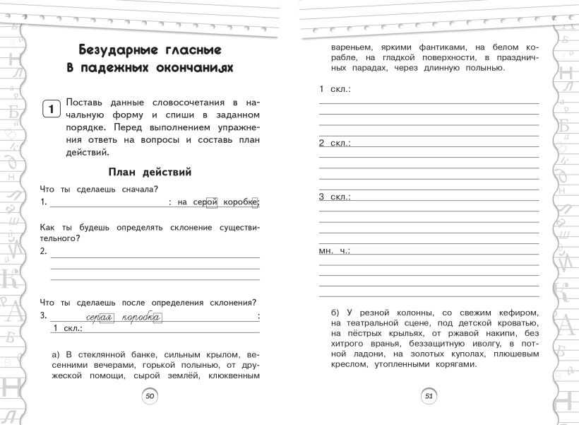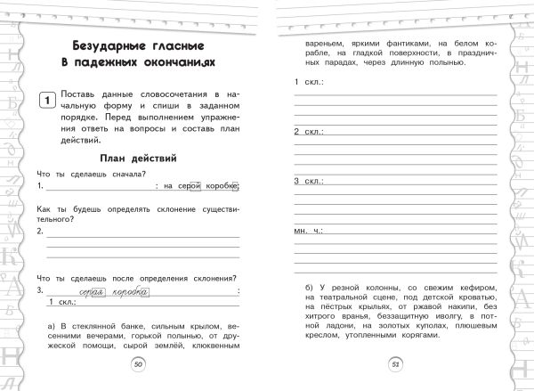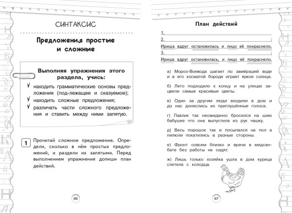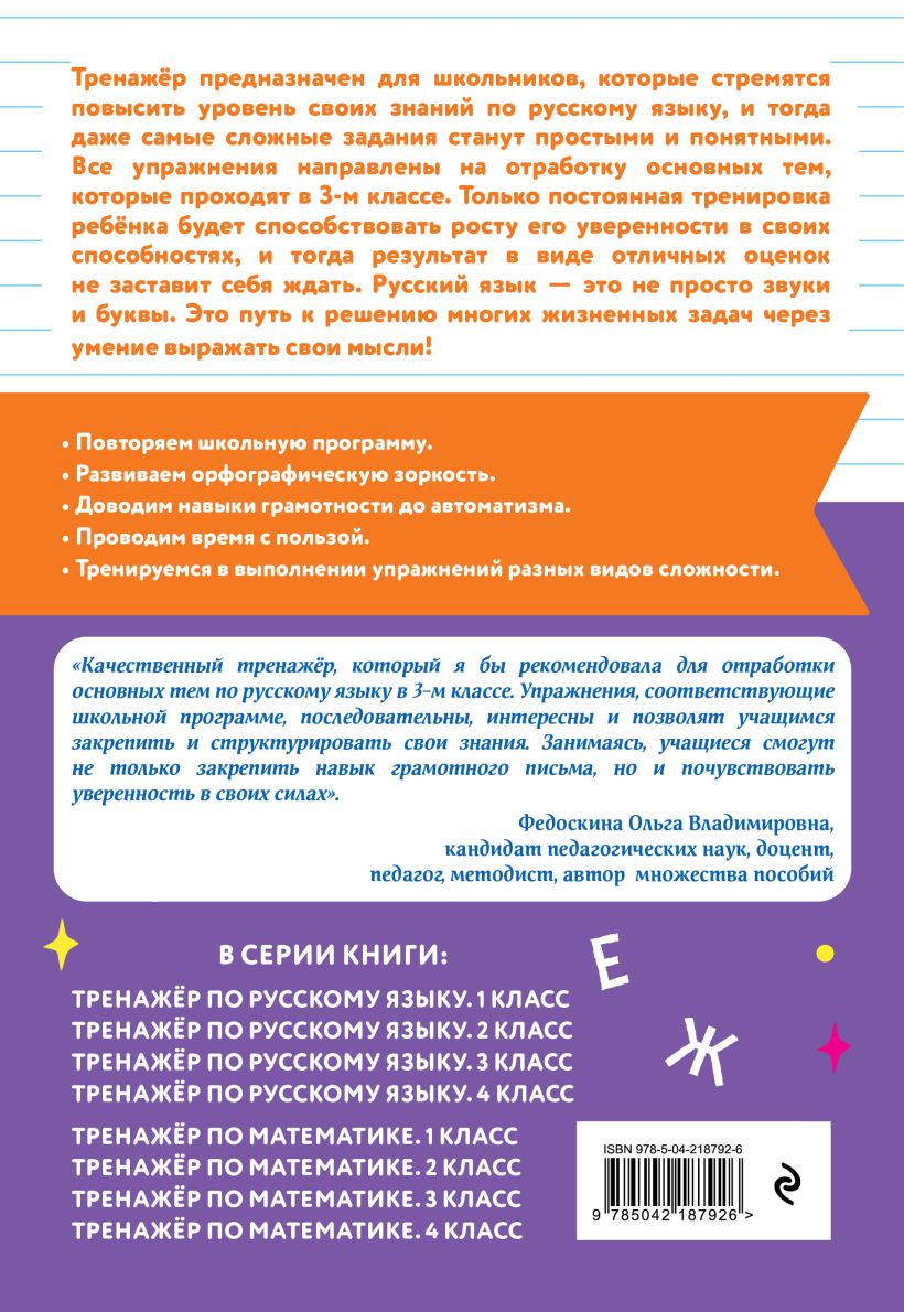 Пособие по русскому языку от издательства «Эксмо» подготовлено в соответствии с требованиями ФГОС для начальной школы и может быть использовано с любым из действующих учебников для 3 класса. Удобный тренажер с интересным современным макетом поможет ребенку улучшить грамотность, восполнить пробелы, углубить и систематизировать знания. Занимаясь, школьник не только повторит правописание безударной гласной в корне, приставок и предлогов, безударной гласной в падежных окончаниях, потренируется различать простые и сложные предложения, но и научится работать по плану, то есть выполнять определенный алгоритм действий, который поможет ему осознанно применять правила. Когда навык грамотного письма будет доведен до автоматизма, результат в виде твердых знаний и отличных оценок не заставит себя ждать.