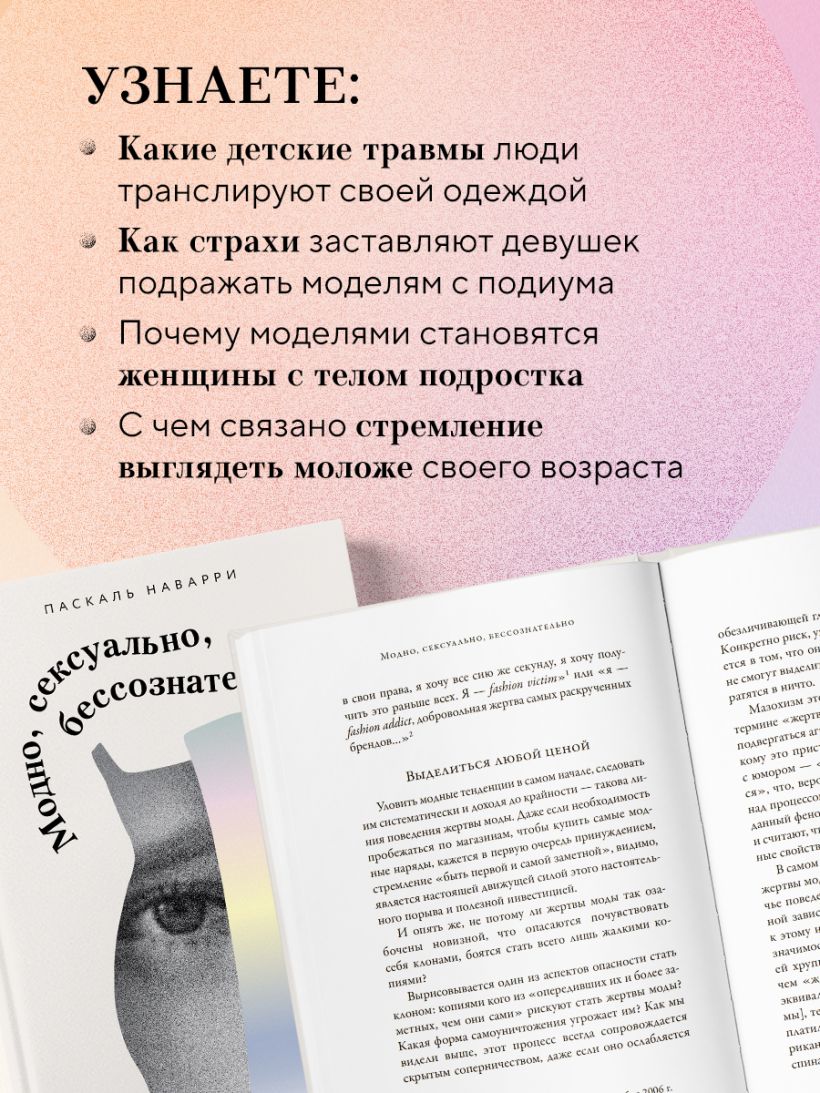 С помощью психоанализа автор отвечает на вопросы, о которых принято молчать: андрогинность в модельном бизнесе, вечный инфантилизм, логомания и шопоголизм.
