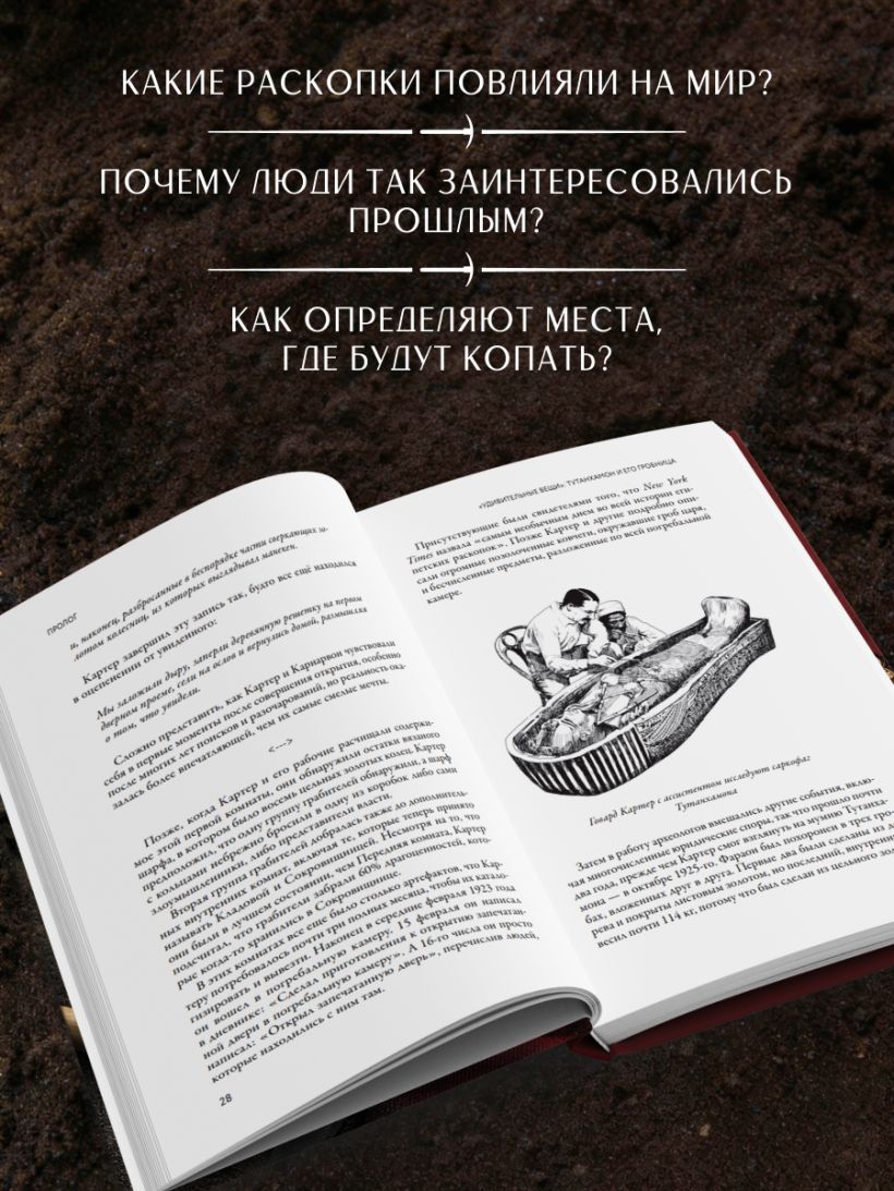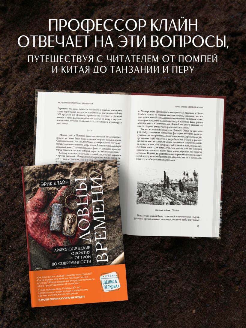 Клайн зовет нас в захватывающее турне по эпохам и континентам: Помпеи, Египет, Троя, Ур, Копан... а также доисторическое искусство пещер Шове, раскопки скелета раннего гоминида «Люси» в Эфиопии, отпечатки ног возрастом 3,6 миллиона лет в Танзании, древнейшее поселение Гёбекли-Тепе («Стоунхендж Турции»), корабль бронзового века из Улубуруна, остров Санторини, Теотиуакан, китайская терракотовая армия и ледяная мумия Этци, Мачу-Пикчу и линии Наска и многие другие новые открытия — все это описано в этой книге. Его живое повествование дает ключи к пониманию археологии, сообщая о самых последних достижениях в исследованиях. Он также рассказывает о методах, используемых сегодня для обнаружения, датировки и сохранения артефактов прошлого.
