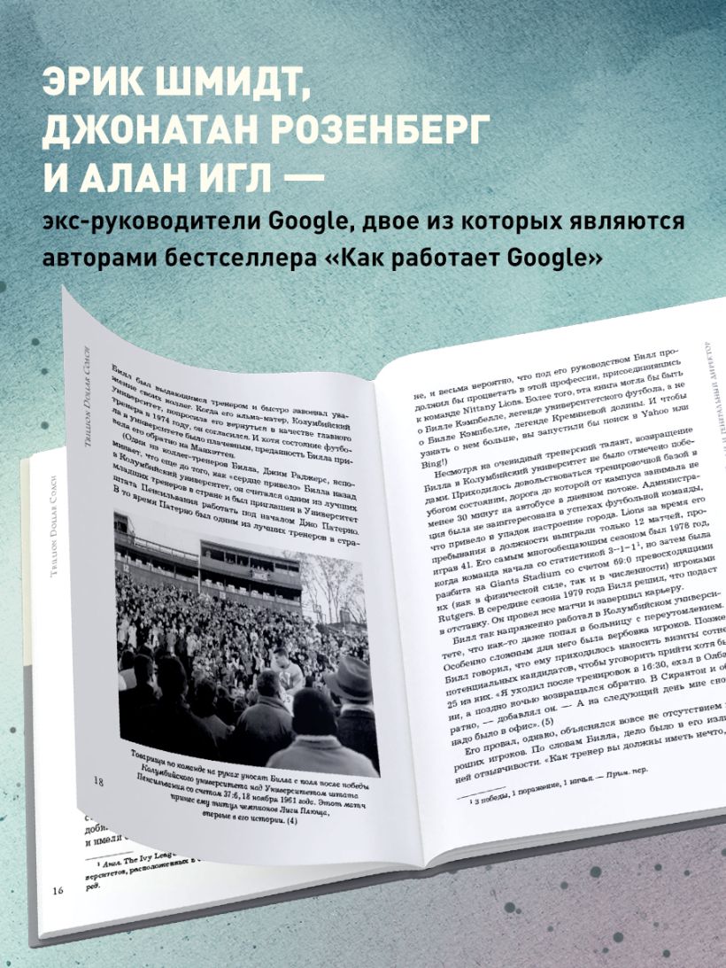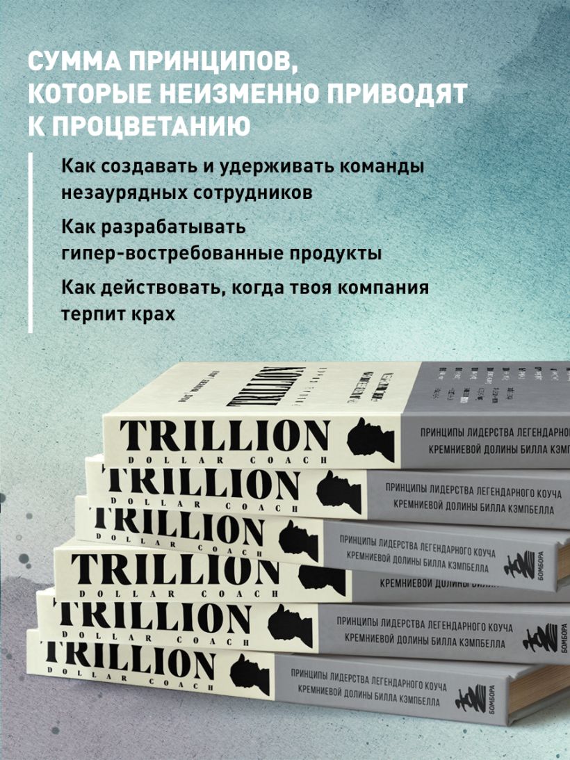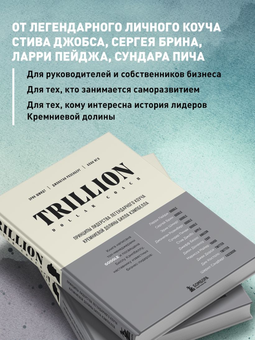 Книга «Trillion Dollar Coach. Принципы лидерства легендарного коуча Кремниевой долины Билла Кэмпбелла», написанная Эриком Шмидтом, Джонатаном Розенбергом и Аланом Иглом, включает в себя уникальные принципы решения сверхсложных задач, связанных с созданием нетривиальной команды и достижением высоких результатов.