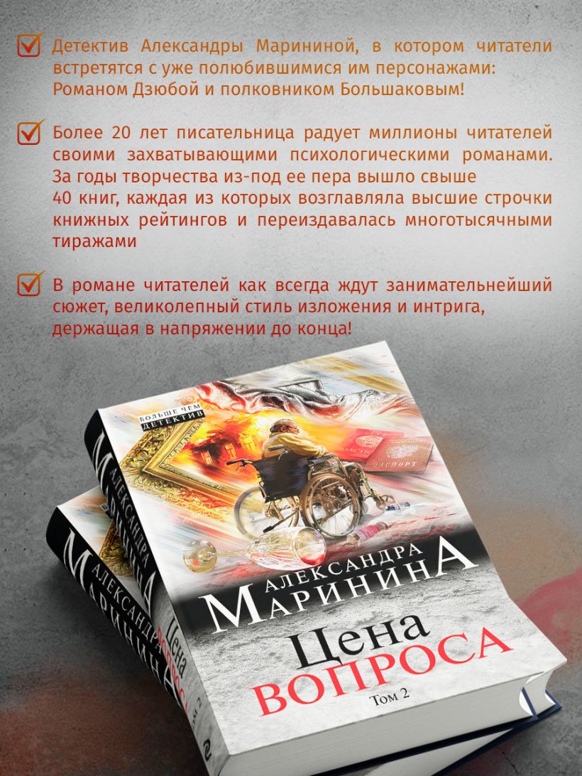 Об авторе Александра Маринина - популярный российский прозаик, автор всенародно любимых детективов, издаваемых миллионными тиражами и не раз экранизированных, один из самых известных, публикуемых и читаемых авторов современности. Жанр Детективный роман. О книге Генерал МВД Шарков руководит секретной Программой, которая должна освободить правоохранительную систему от слабых и прогнивших элементов: коррупционеров, взяточников, нарушителей законов, которые они призваны блюсти. И всё идет по плану, пока из-под контроля не выходит один из участников Программы. Его необходимо остановить, иначе Программе конец. Под угрозой не только сложнейшая операция, но и жизнь генерала... В романе мастерски исследуется тонкая грань между гуманизмом и жестокостью, справедливостью и преступлением, преданностью идеям и болезненным фанатизмом. Что делать, если закон существует не для всех? И если старая система не работает, значит ли это, что всё дозволено? Если ответы кажутся простыми, скорее всего, они неверны. Особенности «Цена вопроса» - новый роман Александры Марининой в двух томах. Главные герои - капитан Роман Дзюба и полковник Константин Большаков - уже известны читателям по другим книгам: они дружат с известным всем детективом Настей Каменской. На этот раз они оказались в сложном положении: между горой трупов и внутренней Программой ведомства, с полубезумным убийцей, который подбирается всё ближе...