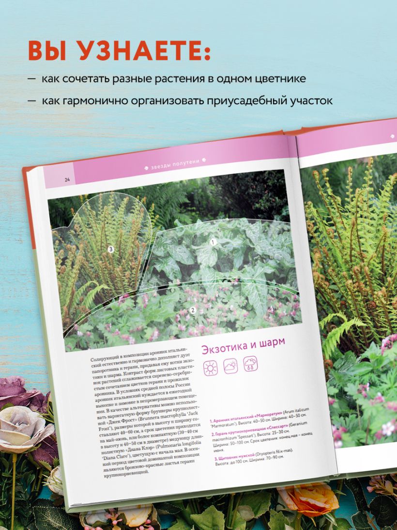 - Эта неповторимая коллекция композиций подойдет как для опытного, так и для начинающего цветовода, ведь в ней подробно разобраны сочетания растений, их основные особенности и характеристики.