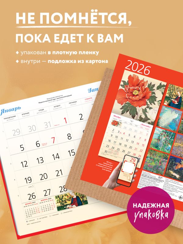 В этом настенном перекидном календаре на 2026 год представлены знаменитые картины великих художников. Повесьте этот календарь в своем доме или на рабочем месте, и он достойно украсит любой интерьер. А календарный блок напомнит о важных событиях года. В центре календаря помещен большой арт-постер, который может стать отдельным декоративным украшением интерьера.