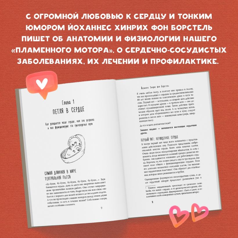 Кто такой Йоханнес Хинрих фон Борстель? Это немецкий автор, но в первую очередь важно, что он изучал медицину и по профессии является врачом-кардиологом. Читая книгу, явно чувствуется искренний интерес автора к сердцу, сердечно-сосудистой системе и всему, что с ними связано, а началось для юного мальчика всё с того, что его дед умер от сердечной болезни, и Йоханнес не понимал, как такое возможно, если на фотографиях дед выглядел таким здоровым. Йоханнес посвятил много времени (всю жизнь) чтению специальной литературы, что в конце концов вылилось в профессию: "Чем больше я узнавал, тем сильнее меня восхищал этот маленький - размером с кулак - сгусток энергии, что находится у нас в груди. Именно тогда я безнадёжно влюбился: моё сердце воспылало любовью к сердцу". И действительно, наше сердце обладает впечатляющей производительностью: оно стучит примерно 100000 раз в день, при каждом сокращении приводя в движение 85 миллилитров крови (в день это 8500 литров). Йоханнес кому-то покажется слишком молодым (он 1988 года рождения) для того, чтобы доверять всему написанному, но, во-первых, для выхода книги в России были привлечены рецензенты, имеющие какое-никакое отношение к медицине, а во-вторых, очень многое вы знаете со школьного курса биологии - автор лишь расширит границы ваших знаний. Книга написана легко, понятно, интересно, рассчитана на широкий круг читателей, сдобрена капелькой юмора, украшена уместными сравнениями с жизненными ситуациями, содержит в себе описание некоторых случаев из практики Йоханнеса, а также опирается на результаты статистических исследований.