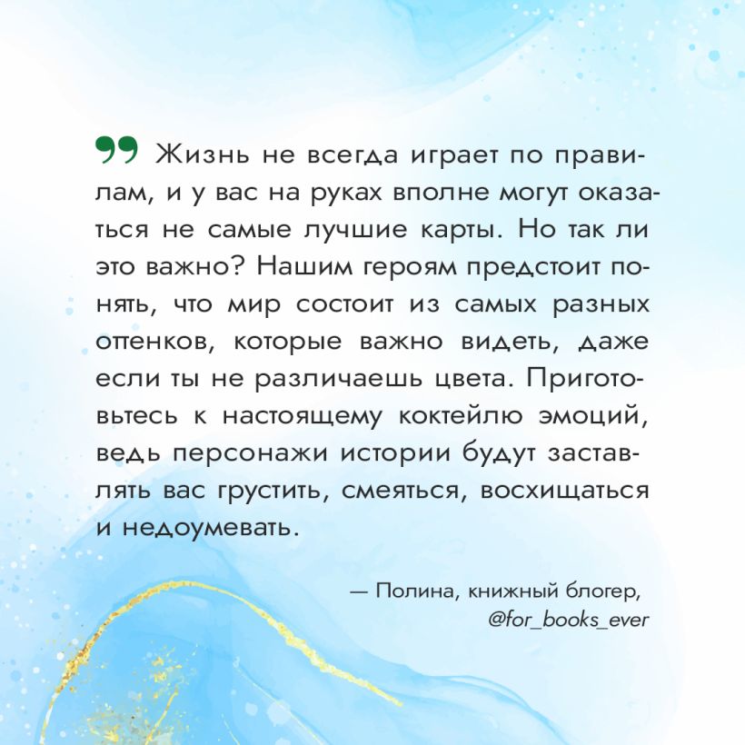 «Жизнь не всегда играет по правилам, и у вас на руках вполне могут оказаться не самые лучшие карты. Но так ли это важно? Нашим героям предстоит понять, что мир состоит из самых разных оттенков, которые важно видеть, даже если ты не различаешь цвета. Приготовьтесь к настоящему коктейлю эмоций, ведь персонажи истории будут заставлять вас грустить, смеяться, восхищаться и недоумевать». — Полина, книжный блогер, @for_books_ever
