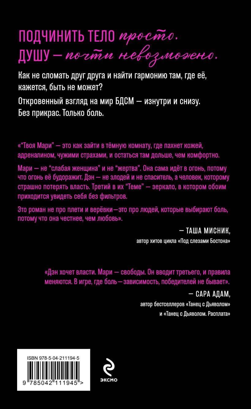 Мари — не "слабая женщина" и не "жертва". Она сама идёт в огонь, потому что огонь её будоражит. Дэн — не злодей и не спаситель, а человек, которому страшно потерять власть. Третий в их "Теме" — зеркало, в котором обоим приходится увидеть себя без фильтров. Это роман не про плети и верёвки — это про людей, которые выбирают боль, потому что она честнее, чем любовь». — Таша Мисник, автор хитов цикла «Под слезами Бостона»