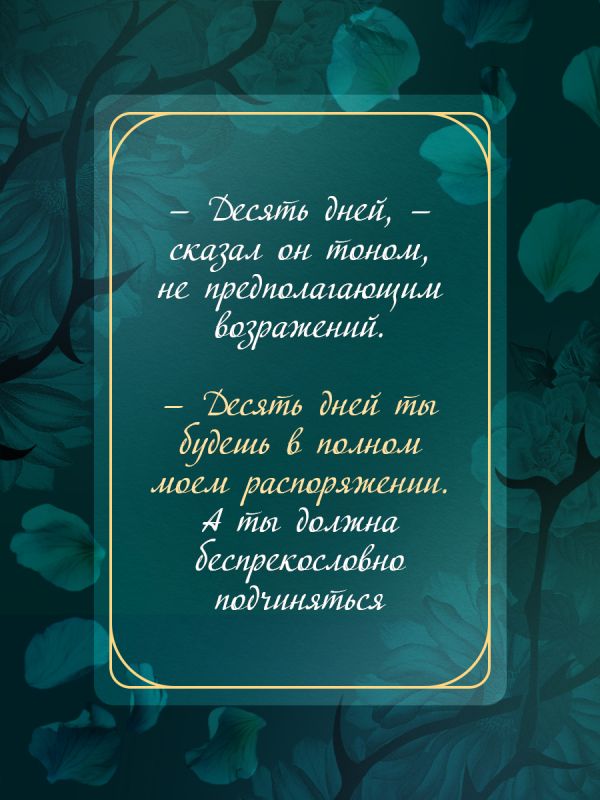 — И ни минутой меньше. Десять дней ты будешь в полном моем распоряжении. Я могу делать с тобой все, что захочу. А ты должна беспрекословно подчиняться. Никаких других условий не будет.