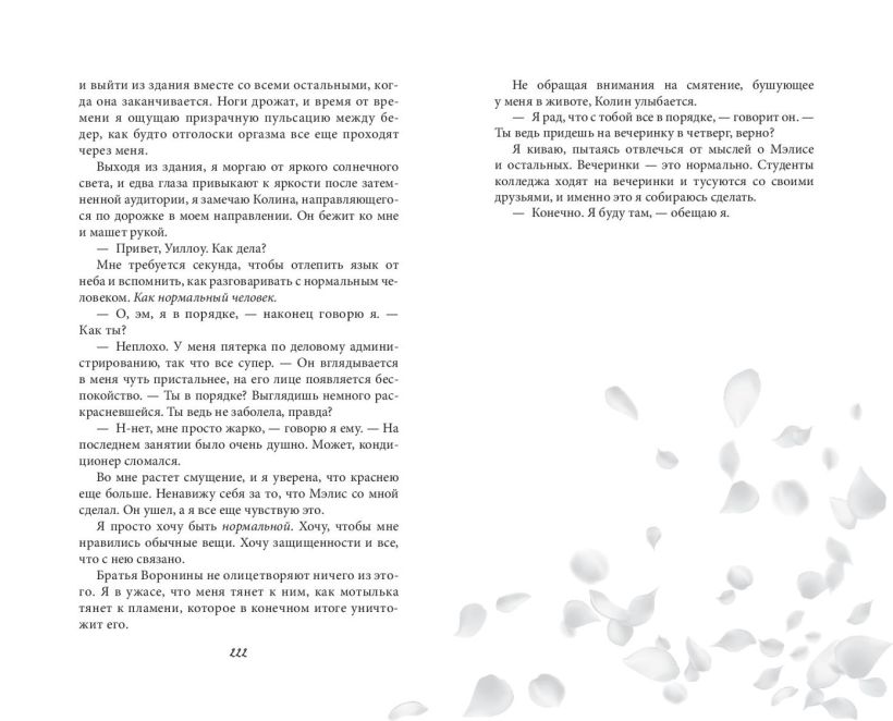 Всю свою жизнь я могла положиться только на себя: мои родители мертвы, приемной матери не до меня, девчонки в кампусе травят за шрамы. Отчаянно нуждаясь в деньгах, я решаюсь продать единственное, что у меня есть — невинность. В ту ночь, когда я должна была отдаться жестокому мафиози, в номер, словно темные тени, ворвались трое парней и убили его прежде, чем он успел ко мне прикоснуться. Я была уверена: теперь умру и я. Но они оставляют меня в живых. Трое опасных братьев сделают все, чтобы я держала язык за зубами, даже если ради этого придется следить за каждым моим шагом. Каким-то образом для каждого из них я становлюсь чем-то большим. Страстным желанием. Навязчивой идеей. Искушением. Как бы сильно я ни пыталась отрицать пугающее влечение, которое пульсирует между нами, я знаю: если не найду выход из этой запутанной игры, их тьма меня поглотит.
