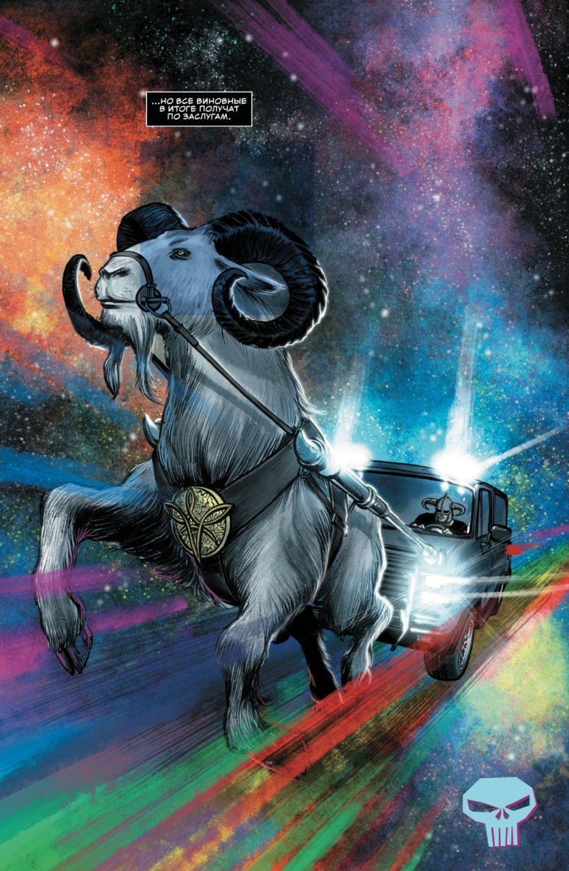 Во время войны миров Фрэнк Касл поклялся отомстить — а таких слов он на ветер не бросает. Но фургон, полный сироток, усложнил его задачу. После войны Карателю предстоит свести пару счетов! Он украл летающего козла Тора и отправился по десяти мирам, ведомый своей целью. Но почему его первой остановкой стала... Анти-Земля?! По пути Каратель обзавёлся неожиданными союзниками, но сможет ли он не дать им погибнуть в бою? Команду из Чёрного Рыцаря,